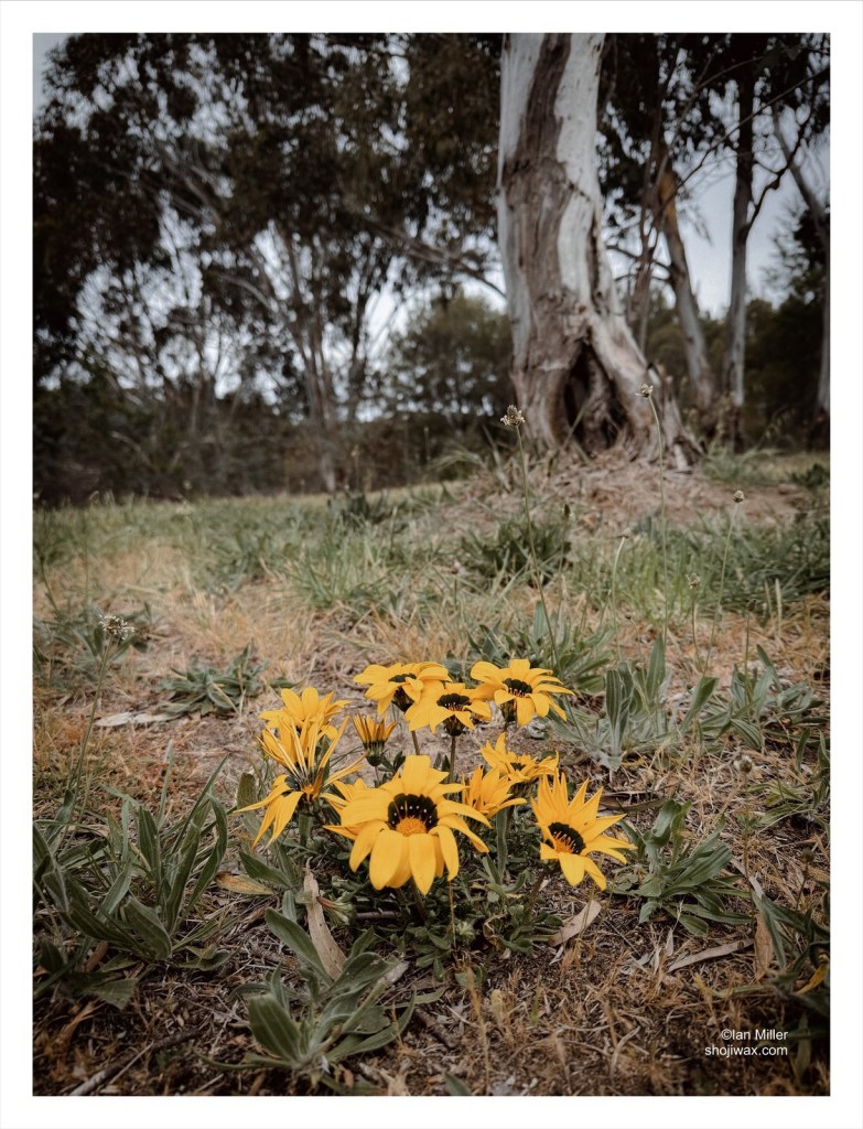 Riding past.…my thoughts well into elsewhere when I spotted this ring of bright yellow flowers out of the corner of my eye.