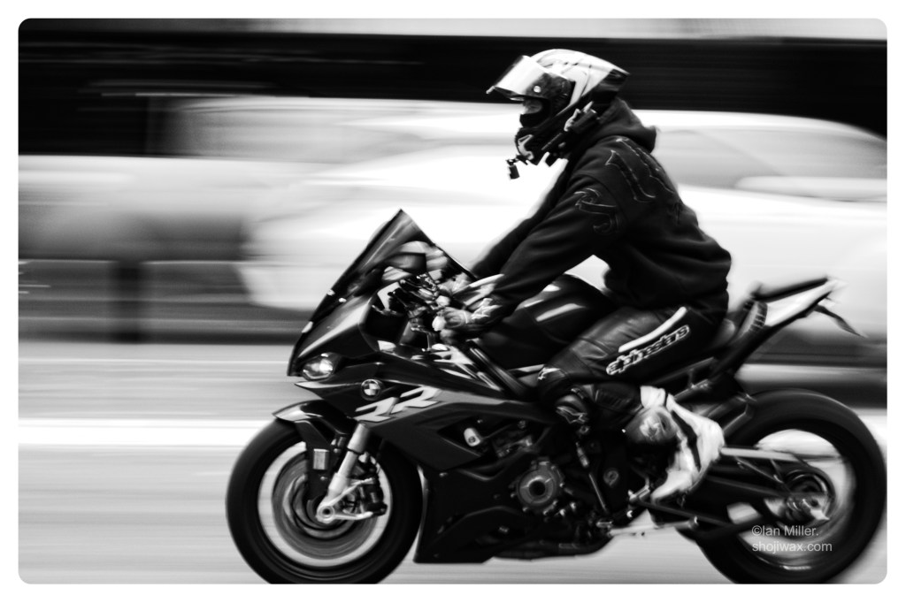 Monochrome photo of motorcyclist riding through a blurred background.